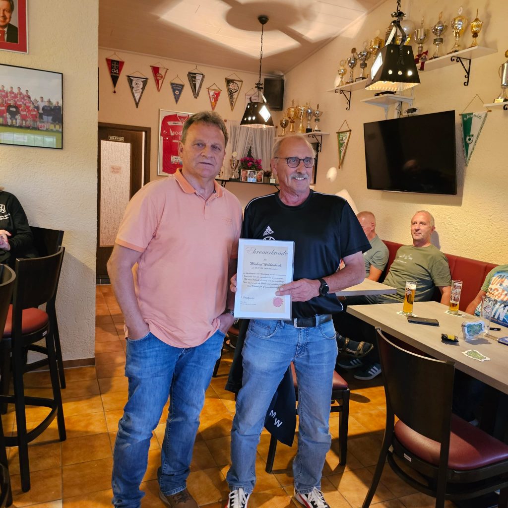 Micky ist bekannt als zuverlässiger und beliebter Mensch. Daher wurde ihm seitens des FC die Ehrenmitgliedschaft zugeteilt und die Urkunde, die dieses bestätigt, von Frank übergeben.