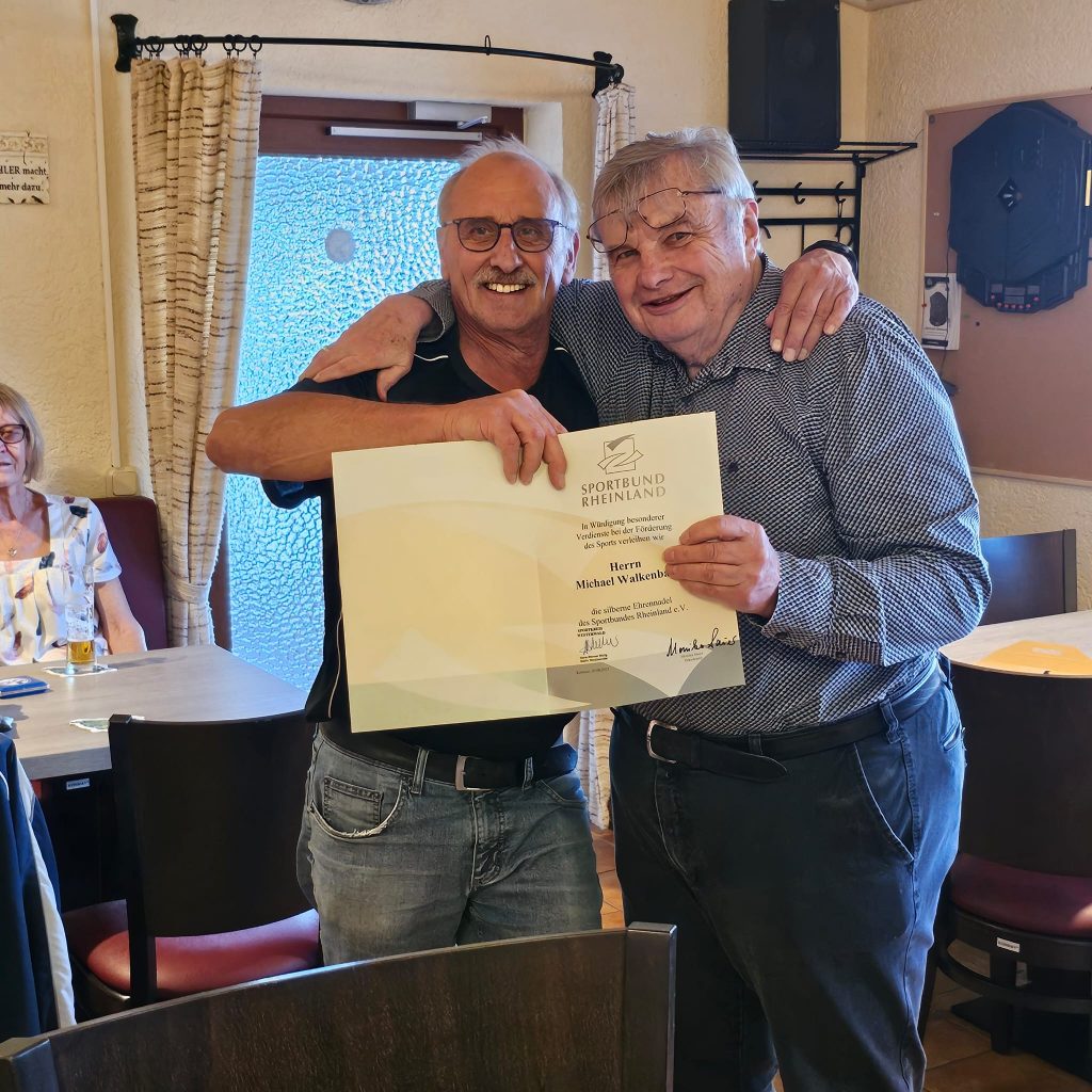 Auch Hans Werner hatte eine Laudatio für Micky vorbereitet mit einigen Anekdoten als Zugabe. Im Anschluss übergab Hans Werner eine Urkunde des Landessportbunds mit der Ehrung sowie die silberne Ehrennadel an Michael.